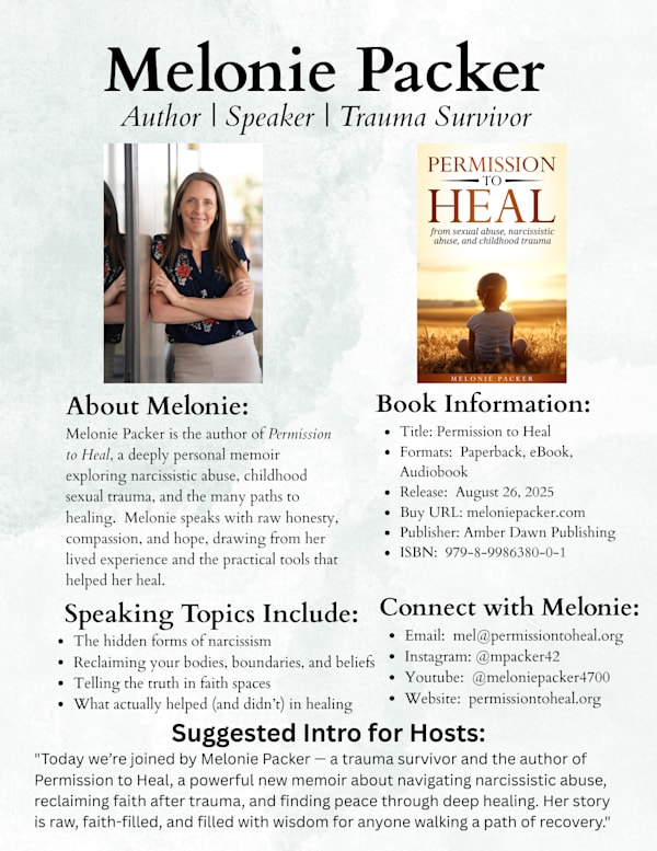 Melonie Packer is a trauma survivor, truth-teller, and voice of compassion for women seeking to heal from deep emotional wounds. Her life’s work weaves together lived experience, hard-earned insight, and unapologetic truth to help others reclaim their voice, rebuild their sense of self, and finally feel seen. Melonie is available to speak at certain events. Contact her at: mel@permissiontoheal.org to check availability.